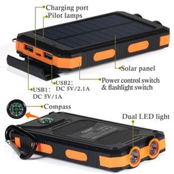 1. Outdoor solar charger: water-resistant shock-resistant and dust proof solar phone charger, equipped with compass and 2LED flashlight. Perfect for outside activity as camping travel hiking constructions and many other emergency use. 2. Dual USB covered by the side: universal 5V/1A and 5V/2. 1A outputs. 3. Superior portable design: made of durable and reliable material ABS+PC+Silicone. 4. Powerful LED light: 2led lights can be used as flashlight with Stand by-SOS-Strobe mode. 5. External battery charger with solar panel can recharge by solar or outlet. But please do not take solar as main power source as it mainly for topping off. Stock in US warehouse,5-7 days fast shipping!!!